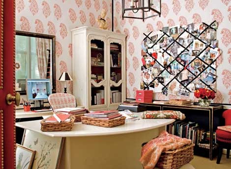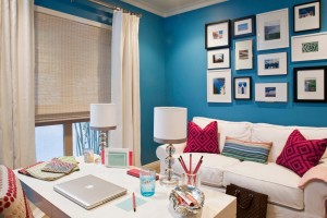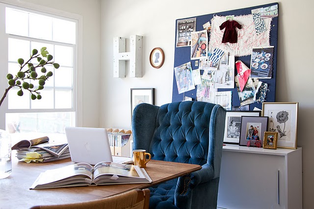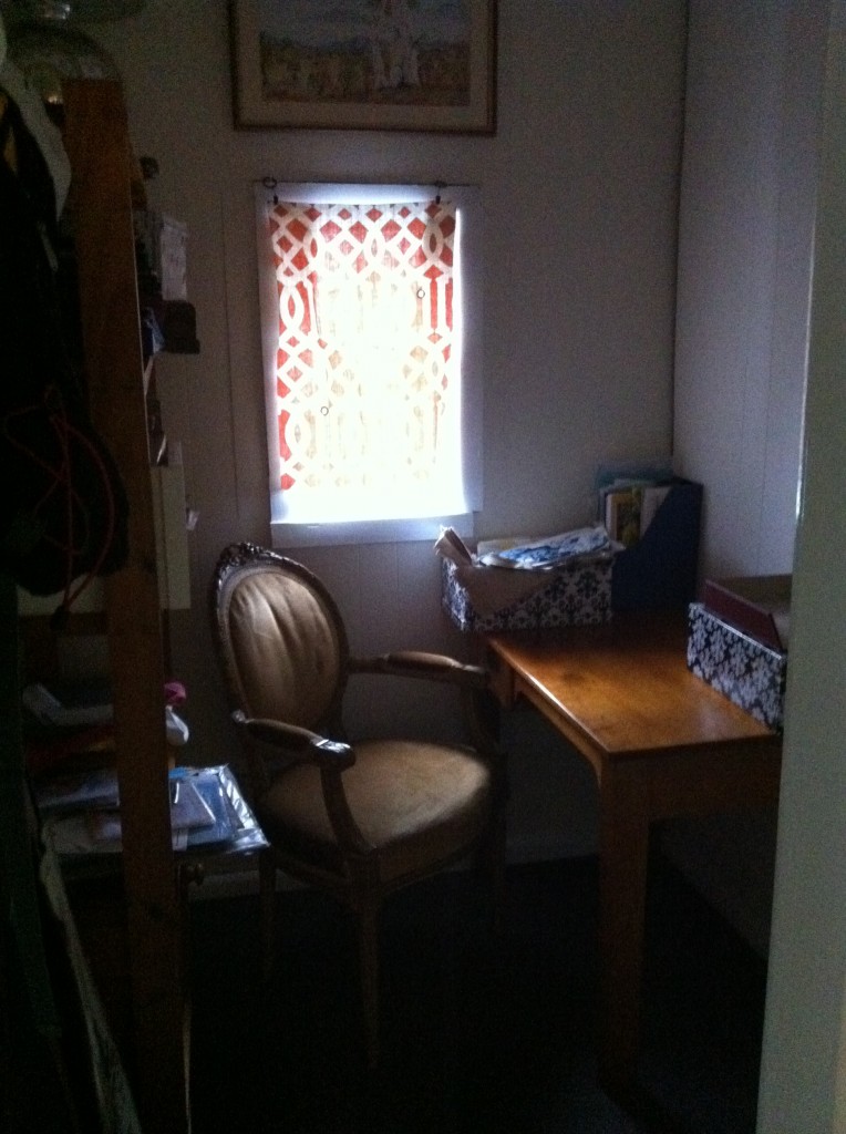 After writing my post last night on feeling inspired by colour and wanting to get cracking on my little home office project, I decided I couldn’t wait any longer! I spent the next few hours clearing out the teeny-tiny room that was housing our linen and all my husband’s clothes (now I have to find a new place for them in our storage-starved house- but that’s a topic for another post!), and by night’s end I had set up a temporary office arrangement using an old pine bookshelf and our little antique silky-oak desk that I was storing in the shed for when the kids are older.
