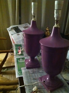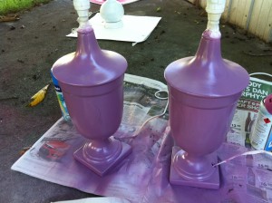 I thought I’d use the pink on a lamp for my office makeover. And the purple for the pair of lamps. I figured I’ll see how it goes and I can always re-do them later when I get a shade I really like. So I taped up the brass fitting at the top and the cord,