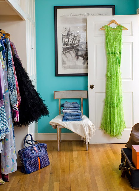 Would you be brave enough to paint a room in bright aqua? Doesn’t it look great as a backdrop for lime green and purple?