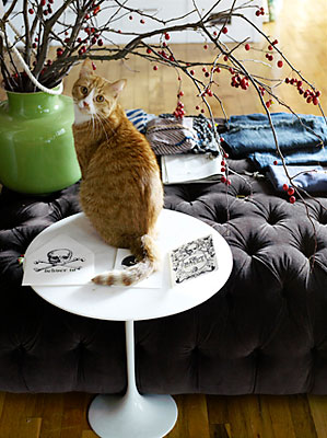 I love this pic - deep purple upholstery paired with leopard print, and a peek of kelly green geometric on the side..