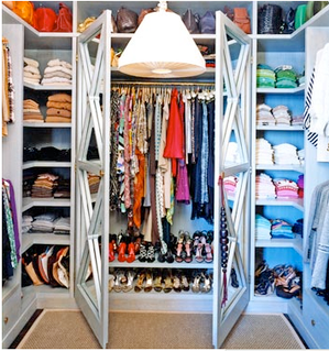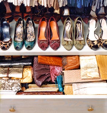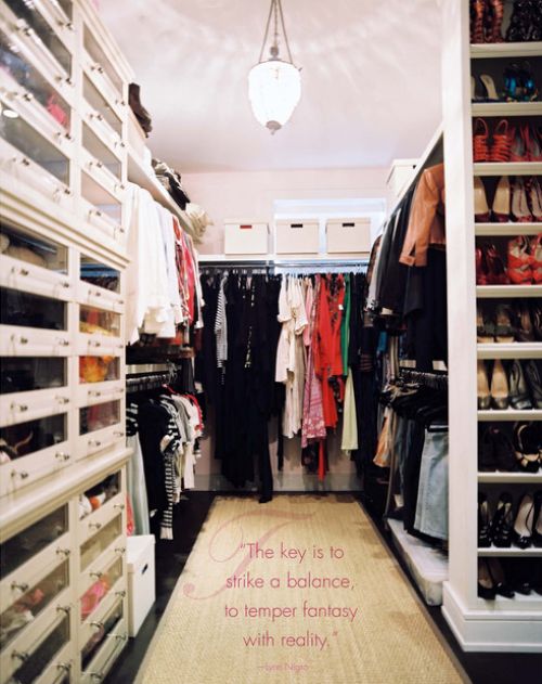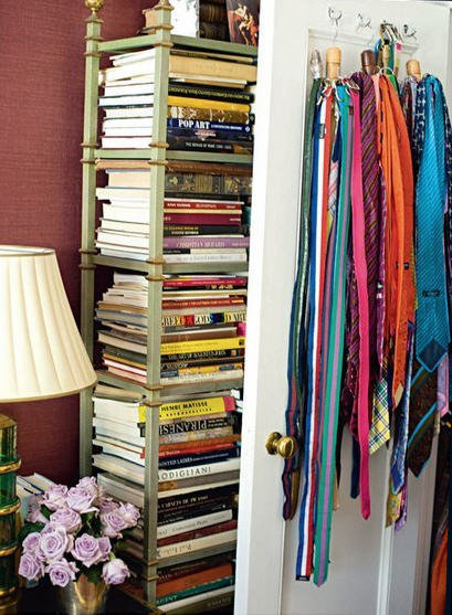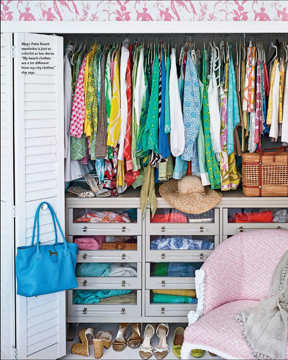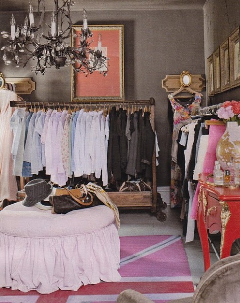 Don’t you love getting a little glimpse into other people’s wardrobes? You know those spreads on celebrity wardrobes, where the shoe section alone is the size of an average bedroom? I like organisation but they are sometimes a little too perfect for me. My favourite wardrobes (or closets!) are the ones where the design is interesting, but also where you get to see an accidental pairing of colours that happen to be showing. For me those little random snippets of colour are so inspiring. Like above, Hamish Bowles’ belt and tie collection provides a gorgeous display of pink, purple, orange and turquoise.