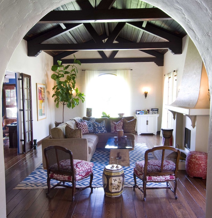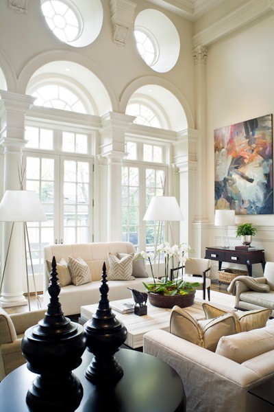 I’ve been dreaming lately about building a new house, and number one on my wish-list is a double-height living room, or some sort of high and interesting ceiling line. I really don’t like the look of flat (especially low!) plasterboard ceilings that are punctuated by various ugly ceiling necessities- vents, smoke alarms, downlights etc. I love ultra-high ceilings and that feeling of airiness and space. The room above is a dream! What a great mix of the rustic and the elegant, and all those gorgeous windows!