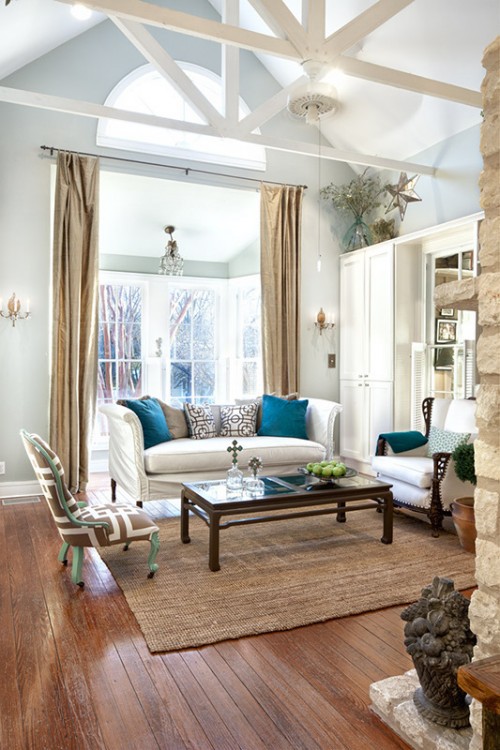 Love this mix of blues and neutrals with natural timber and stone (above). But the high ceiling and window makes the room.