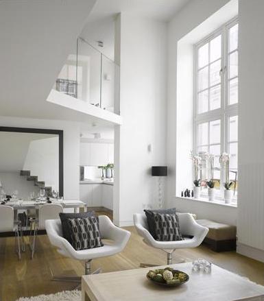 I’m really drawn to this New York loft-style double height room (above), and this modern beach house (below). I just love the idea of an upstairs walkway or bridge overlooking the living room, and sunlight coming into the room from high North-facing windows is an absolute must.