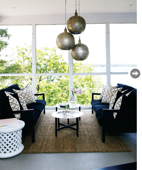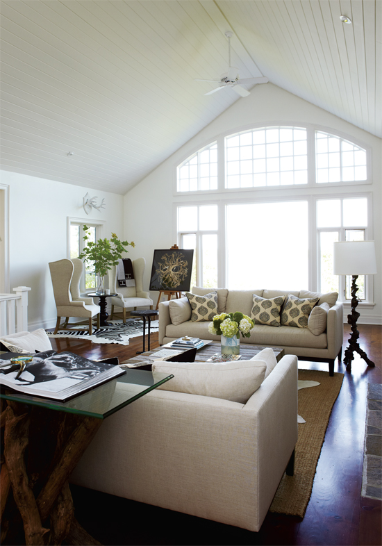 I love this beautiful Hamptons-inspired living room. The shades of grey with powder blue and pale lavender are gorgeous, and I love all the natural light and the beachy white tongue and groove panelled walls. But the best part has got to be the herringbone brick floors paired with the casual-but-stylish sisal rug. If I could build my dream home my double-height living room would have windows and floors like this!