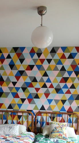 Look at all the pattern in the red and grey master bedroom- and the wall of mismatched artworks - it’s fun, warm and cosy.