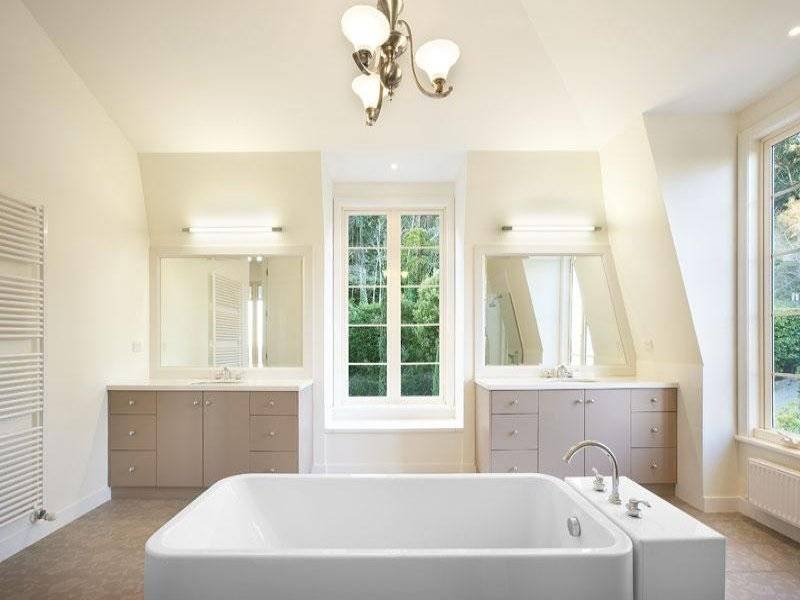 Finally, isn’t this such a neat use of a little bathroom corner? The curved ‘floating’ bench is unobtrusive and I love the little niche below for the towels! My favourite parts of this bathroom though are the floor tiles and the twin high windows, twin industrial pendants offset by the centred mirror.