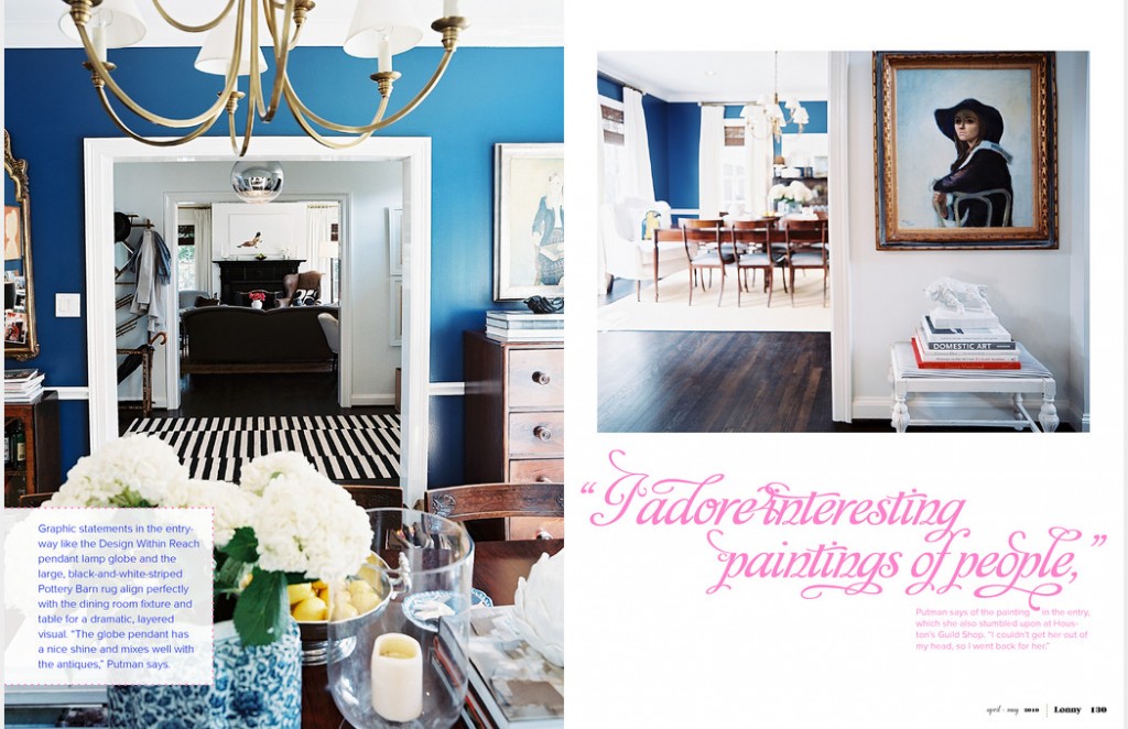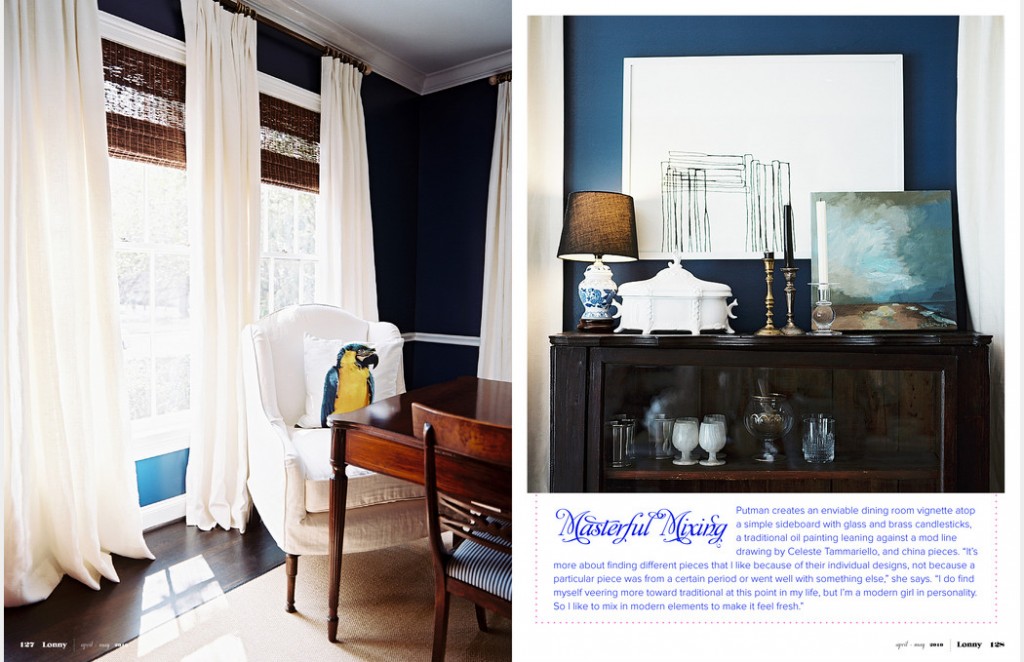 Well no sooner do I finish posting today about Ashley Putnam’s (nee Haley) gorgeous decorating, that I read the latest issue of Lonny (the April/May 2010 issue - yes I know I am shamefully behind the times), only to find that it features her new home. And I have to say, it’s even more beautiful than the last one. I am just so in love with the mix of styles, the art displays everywhere, and the blue dining rom! It’s been a long time since I have seen a house this inspiring, that I just want to sit and analyse every detail. Take a look at this amazing house: