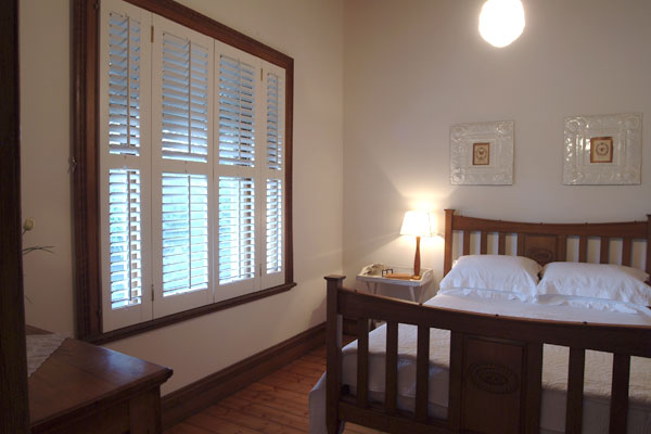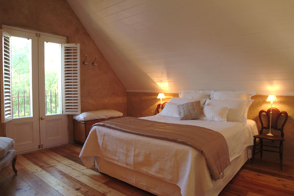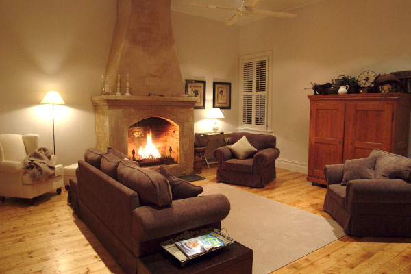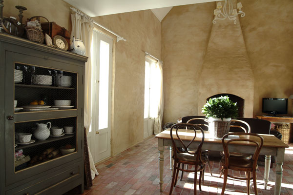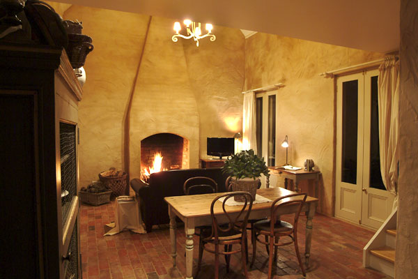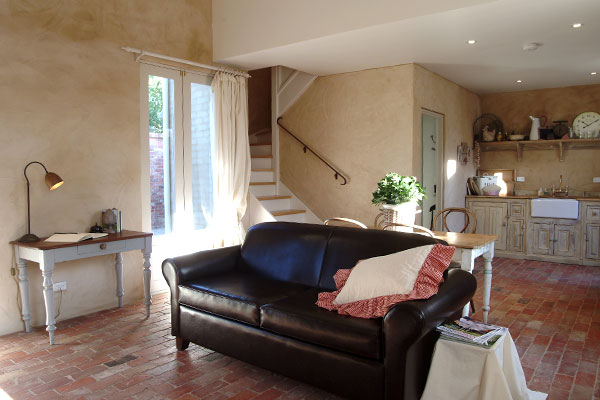 I think this must be the bed and breakfast cottage - how gorgeous is it? Love the double-height living room, rough-rendered walls and the brick floor. What a great room for a winter night..