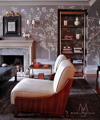 I wonder which came first: the recess in the wall or the shelves! (above). I like the way the wallpaper wraps around behind the bookcase.