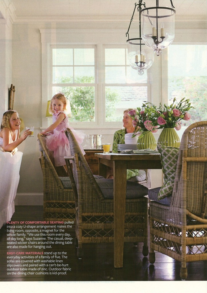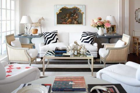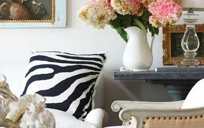 I just love these two beautiful yet casual living rooms. They’ve been in my inspiration files for ages and ages. The one above is a little more elegant and neutral, with some french provincial touches. The zebra pillows and black and white striped rug keep it from looking formal. While I love the pale pinks and greens in the family-oriented open-plan room below. Can you spot the common element between the two? Yes! The zinc side tables - love them!