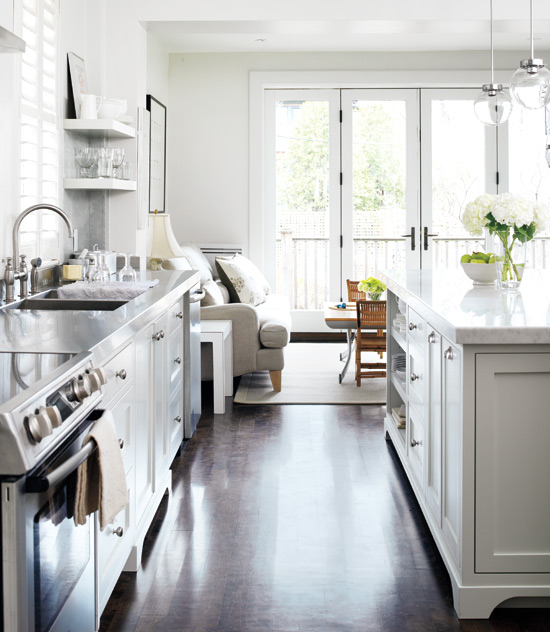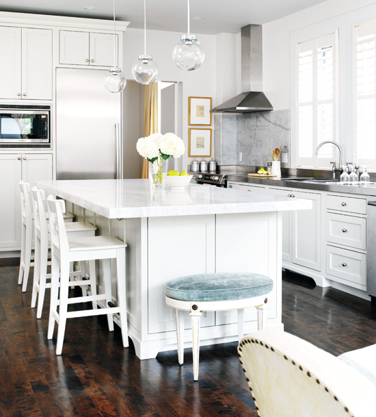 What a fabulous family room/kitchen. I love that little blue stool and those round glass pendants- totally beautiful and inspiring, thank yu!