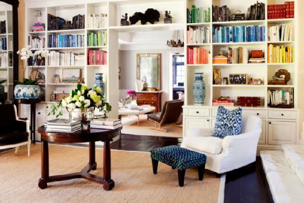 I’m a sucker for stylish bookshelves and these are among my favourites. There are lots of classic elements that appeal to me here: the dark wood floors, marble steps to the right, sisal rug, bookshelves over the doorway and a glimpse through to another couple of (gorgeous) rooms. Add some classic-style furniture, some colour-coded books, chinese blue-and-white and a hint of ikat and I’m in heaven!