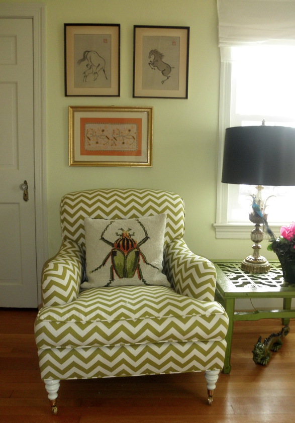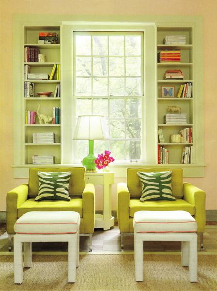 Beautiful symmetry! What a combination of greens here. I want a house with bookshelves built in next to the window like this - I love this kind of detail!