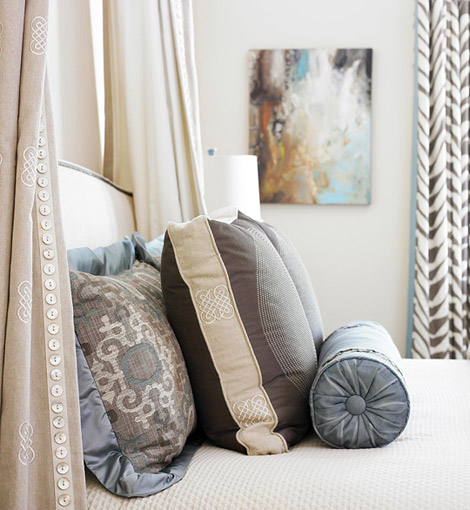 How beautiful is the fabric detail in this bedroom? First of all I love the colours: pale taupes and slate greys. Then there’s the mix of textures and shapes, and the details in trims and embroidery. It’s the attention to the smallest elements here that would make this such a beautiful bedroom to go to sleep in!
