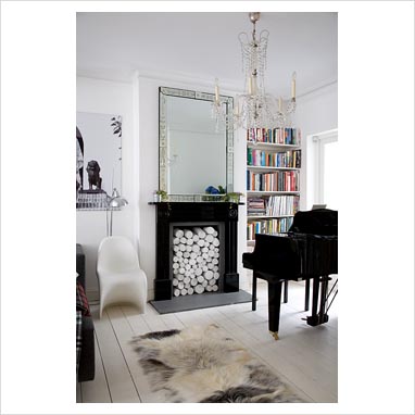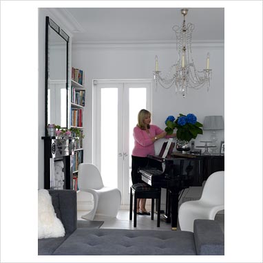 I love the white, grey and black and the use of the small space above and below - ignore the chandelier and the piano!