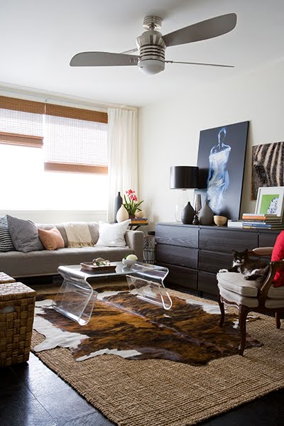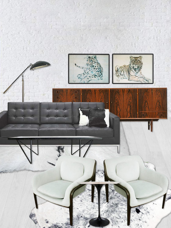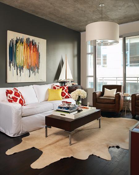 Well, yes! I can picture exactly how fabulous (though maybe I shouldn’t use that word for a man-pad) P’s apartment could be! I’m thinking cow hide rug(s), some 50s influence in timber furniture and sofa, some industrial elements (think light fitting and lamps, industrial-style shelving and brackets for instruments on a wall). I’m thinking some white walls and maybe the entry way and bedroom, or the kitchen, in dark navy or black (believe it or not black can make small spaces look bigger!), some abstract art and also some black and white photos, some mid-century classic pieces included in the furniture. Maybe timber floors, a grey low-lying long sofa, one or two (depending on space) vintage Danish tan leather chairs, some black and some white finishes in there too..it could be fantastic! Here are some ideas to get you started..