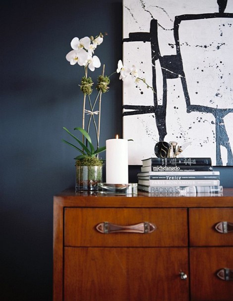 Noma, I am trying to inspire and motivate (P) in his (slow moving) apartment search by showing him some of your posts on more masuculine style… so far he likey likey, but maybe you can post some more ideas that might be good? he found most appealing the navy rooms, stainless steel and dark wood, vintage style as well as modern features- you know he can paint so i am encouraging him to do some nice grey palette abstract paintings- if they turn out good i will see if he can do something for you as well. Also some way to display him guitars, amp, percussion etc as at the moment they just clutter up a corner. Most likely space will also be an issue. Any inspiring ideas??