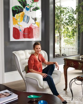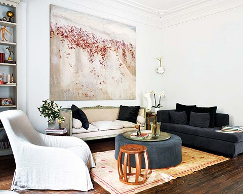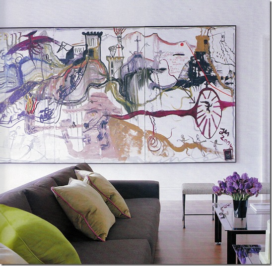 As I posted about art yesterday I thought I’d share a few more rooms where the focus is on the amazing artwork. The room above is one of my favourites, because of the colour scheme but also because of the mix of styles and shapes. It mixes geometrics (box pleating on chair upholstery, rug) with curly, feminine lines (side table, curtain fabric, wall sconces) and the textured, industrial style of the painting. It’s something unexpected, like pairing pink chairs with polkadots with this rough, masculine painting that to me can makes a room successful.