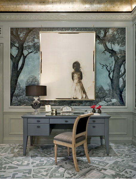 Love the blues here and the ‘map’ carpet, but also how the wall appears to be part of the overall piece (above).