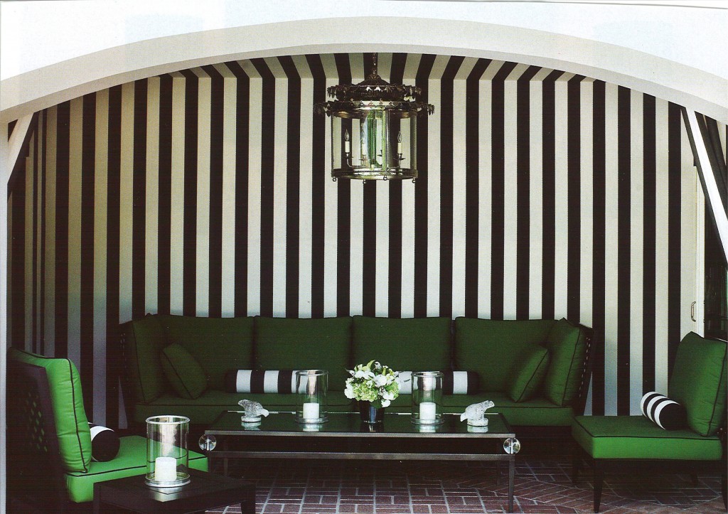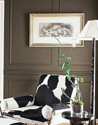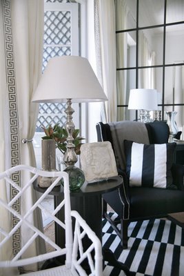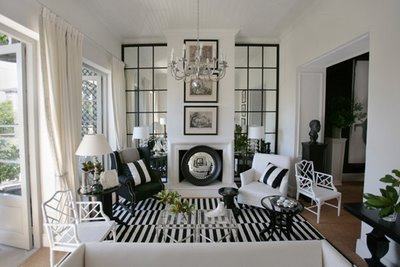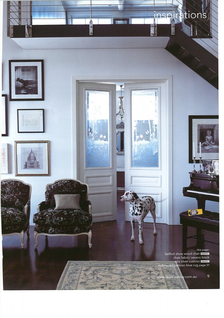 I love this image (above). What makes it for me? The double-height room (on my future wish-list for my house!), the etched-glass doors and the wall of black-and-white-themed framed pictures. This image inspired me to start one at my house, though I stick only to etchings and original drawings, all in black or fine gold frames. The funny thing about this pic for me is that although it’s an ad for Laura Ashley, the only thing about it that doesn’t work and that I would change is the rug (sorry Laura Ashley)! A black and white striped one would add some drama and be a modern play-off against the traditional-style armchairs.