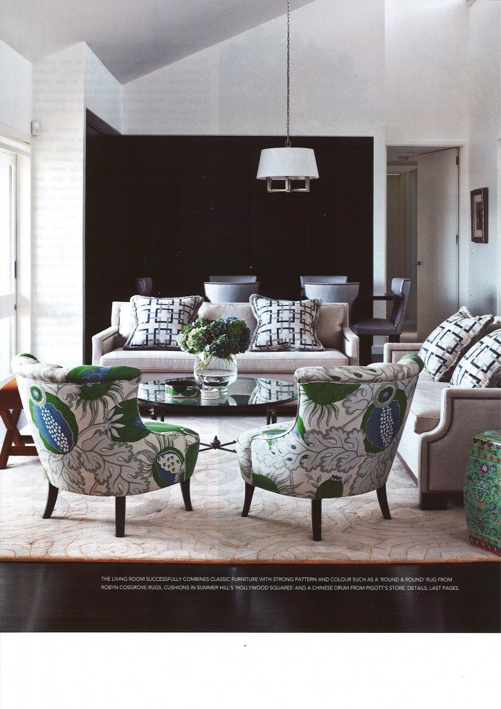 But for me it’s about the genius pairing of the Carnival fabric with the Summer Hill ‘Hollywood Squares’ cushions and the gorgeous Robyn Cosgrove rug. The black panelling to demarcate the dining area is also wonderful and clever - imagine the room with plain white walls there instead - it just wouldn’t be the same.