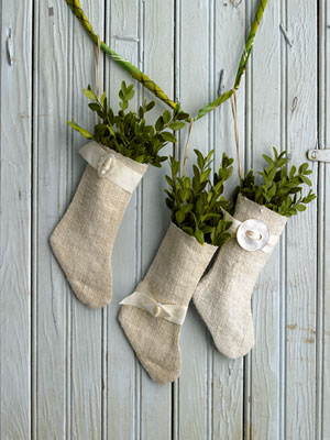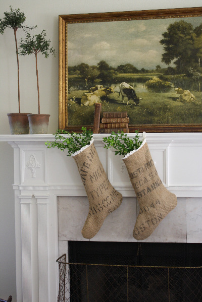 But what I’d really like is some linen or burlap (hessian) ones that are fairly plain, and then pair them with white an silver - I think I could happily do this combination year after year and never get sick of it! Isn’t this image (above) from Holly Mathis Interiors soo beautiful? It’s not just the stockings (made from old sacks) either, it’s the lovely fireplace, old books, delicate topiarys and that wire firescreen - I have to find out where to get one of those!
