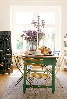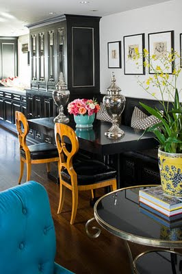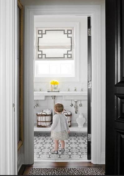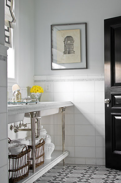 I have always admired people who paint their doors black - I am determined to do it in my own home sometime. Though you need to have nicely moulded doors to do it! I love the combination in the pic above of the bathroom floor tiles, the black doors and the leopard-print carpet! And the black and white blind ties it all together. Brilliant!