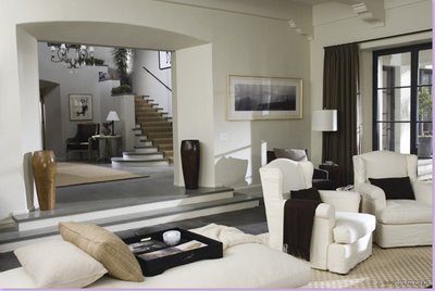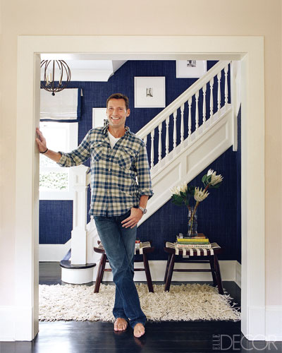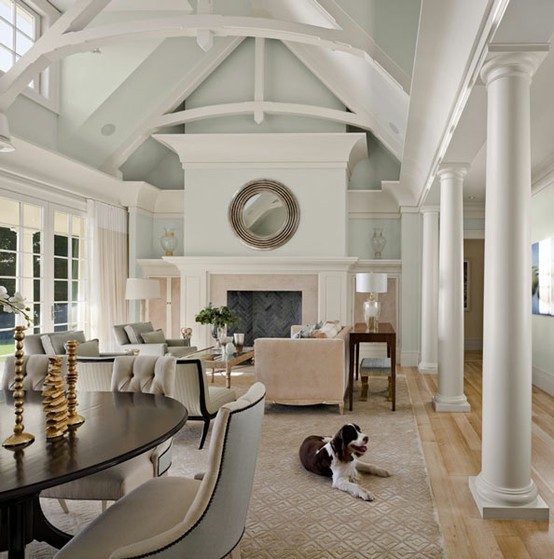 In the entry foyer the timber mouldings and chandelier give a sense of formality, but the large panes of glass framing the doorway and the pocket sliding doors into the adjoining rooms are both more contemporary. Doesn’t that pooch make the whole shot feel more casual and homely?